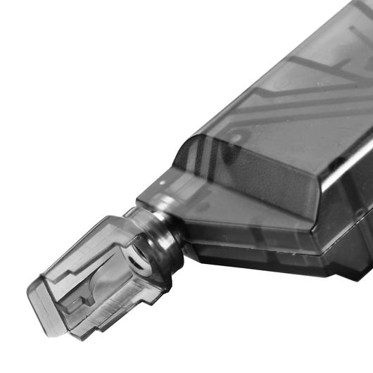 Herausgekommen ist ein Speedloader mit wichtigen und praktischen Verbesserungen gegenüber der breiten Masse an Standard Speedloadern. Die gravierendsten Verbesserungen umfassen eine breitere Kugelzuführung sowie ein eingebautes Kugel-Rührwerk damit die Kugeln immer sicher und zuverlässig zugeführt werden. Auch der verwendete Polymer-Verbundkunststoff wurde verbessert bzw. angepasst damit eine längere Haltbarkeit und Stabilität gegenüber normalen Speedloadern gewährleistet ist.