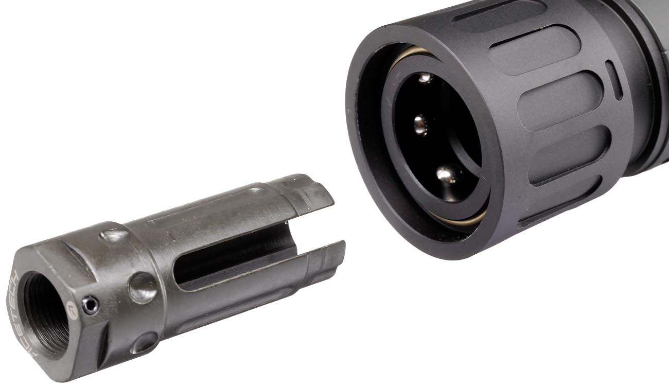 Aufgrund der Schnellwechselvorrichtung, bei der zum Wechseln lediglich der hintere Kranz nach vorne gedrückt werden muss, kann der Silencer schnell montiert oder abgenommen werden. Dazu kommt auch noch die authentische Optik, die durch die äußeren Originalabmaße entsteht. Wie von Acetech gewohnt ist der Silencer weiterhin mit schönen lasergravierten Markings und einer fortlaufenden Seriennummer versehen. Hergestellt wird der ca. 137 mm lange Silencer aus besonders stabilem Aluminium in Kombination mit Stahl. Der Materialmix sorgt für maximale Stabilität und einem passenden Gewicht von ca. 236 g - inklusiv Flash-Hider und Tracer Unit. Die matt-schwarze Farbe wurde eloxiert und sieht dadurch auch wie das Original aus. Auch der enthaltene Flash-Hider kommt im authentischen 3-Prong Design, ist allerdings komplett aus aus massivem Stahl gefertigt. Praktisch ist beim Flash-Hider das gängige 14mm- Linksgewinde, wodurch dieser an sehr vielen Gewehren aufgeschraubt werden kann.