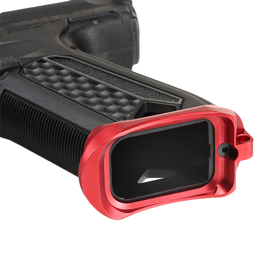 Der Magwell wird präzise im CNC-Herstellungsverfahren aus Aluminium gefertigt und anschließend rot eloxiert. Die Montage an der Pistole erfolgt durch zwei Innensechskant-Schrauben und ist innerhalb sehr kurzer Zeit durchgeführt. Das Design des Magwells erinnert von unten an einen Trichter und sorgt dadurch für einen schnelleren und einfacheren Magazinwechsel.