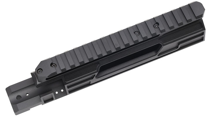 Das obere Hauptgehäuse wurde von Action Army speziell für die Maruzen Type 96 sowie die Well MB01 Gewehrserie entwickelt. Durch das kantige Design wirkt das Gehäuse sehr modern und sorgt gleichzeitig für einen taktischen Eindruck. Das Gehäuse kommt im sogenannten One-Piece Design. Das Gehäuse besteht somit aus einem Teil und ist dadurch stabiler als die Gehäuse im mehrteiligen Design. Für eine hervorragende Passgenauigkeit sorgt das CNC-Herstellungsverfahren. Lediglich die oben angebrachte 21mm Schiene mit einer Länge von ca. 172 mm wird mittels vier Innensechskantschrauben am Gehäuse befestigt. Hierdurch kann die Schiene wahlweise auch abgenommen werden. Die schwarze Farbe an der Außenseite ist bei dieser Variante beschichtet und dadurch sehr widerstandsfähig.