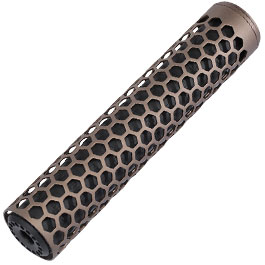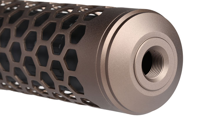 Vor allem die äußere Optik mit eingearbeiteter Hexagon-Wabenstruktur ist sehr interessant. Der eigentliche Silencer darunter ist ebenfalls mit einer schönen Musterung versehen. Auch die Vorderseite ist passend gestaltet und passt perfekt zum gesamten Suppressor.