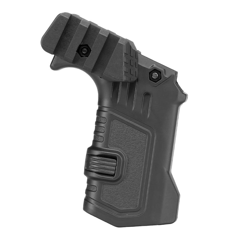 Weiterhin sind zwei seitliche Schienen enthalten, die wahlweise am Griff montiert werden können. Durch diese kurzen 21 mm Rails bekommt der Griff weitere taktische Möglichkeiten hinzu.