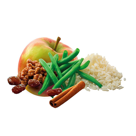 Zutaten: Reis (38%), Sonnenblumenöl, Rosinen (9%), Apfel (8%), Rindfleisch (7%), Zwiebel, Eipulver, Prinzeßbohnen (3%), Glukosesirup, Salz, Kartoffelstärke, modifizierte Speisestärke (modifizierte Maisstärke), Kurkuma, Knoblauch, Paprika, Kreuzkümmel, natürliches Aroma, Fenchelsamen, Koriander, Chili, Ingwerpulver, Muskatnuss, Zimt (0.17%), Bockshornklee, Pfeffer, Nelke, Petersilie, Echter Kümmel, Konservierungsstoff (E220)