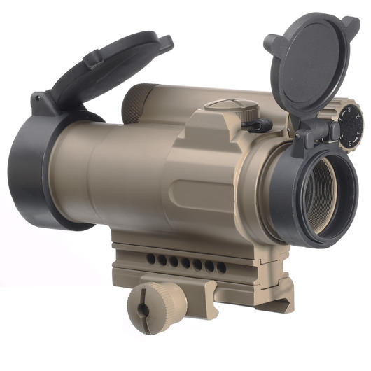 Das Aim-O Military 4 Type ist der Nachbau eines bekannten Rotpunktvisiers, dass besonders häufig bei militärischen Spezialeinheiten genutzt wird. Der Zielpunkt ist höhen- sowie seitenverstellbar um dieses so auf die jeweilige Waffe einstellen zu können. Weiterhin sind jeweils 2 Helligkeitsstufen pro Farbe (Rot und Grün) nutzbar.
