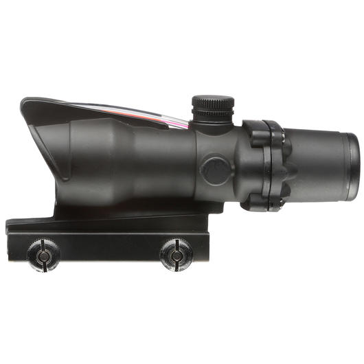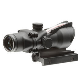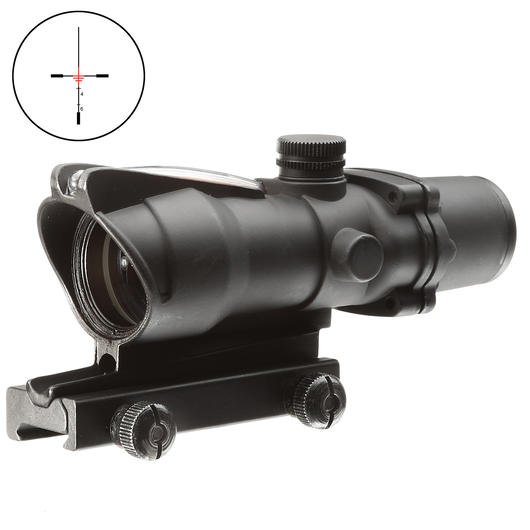 Das Aim-O TA01 ist ein Nachbau eines bekannten Zielfernrohres. Hier in der 4x 32 Zielfernrohr Ausführung. Das rote Leucht-Absehen ist höhen-, seitenverstellbar wodurch das Zielgerät perfekt auf den Schützen bzw. das Gewehr eingestellt werden kann. Dieses erfolgt über die 2 herausstehenden Einstelltürme (oben und links). Im oberen Bereich des Zielgeräts ist zudem eine für kurze Distanzen nutzbare Notvisierung vorhanden.