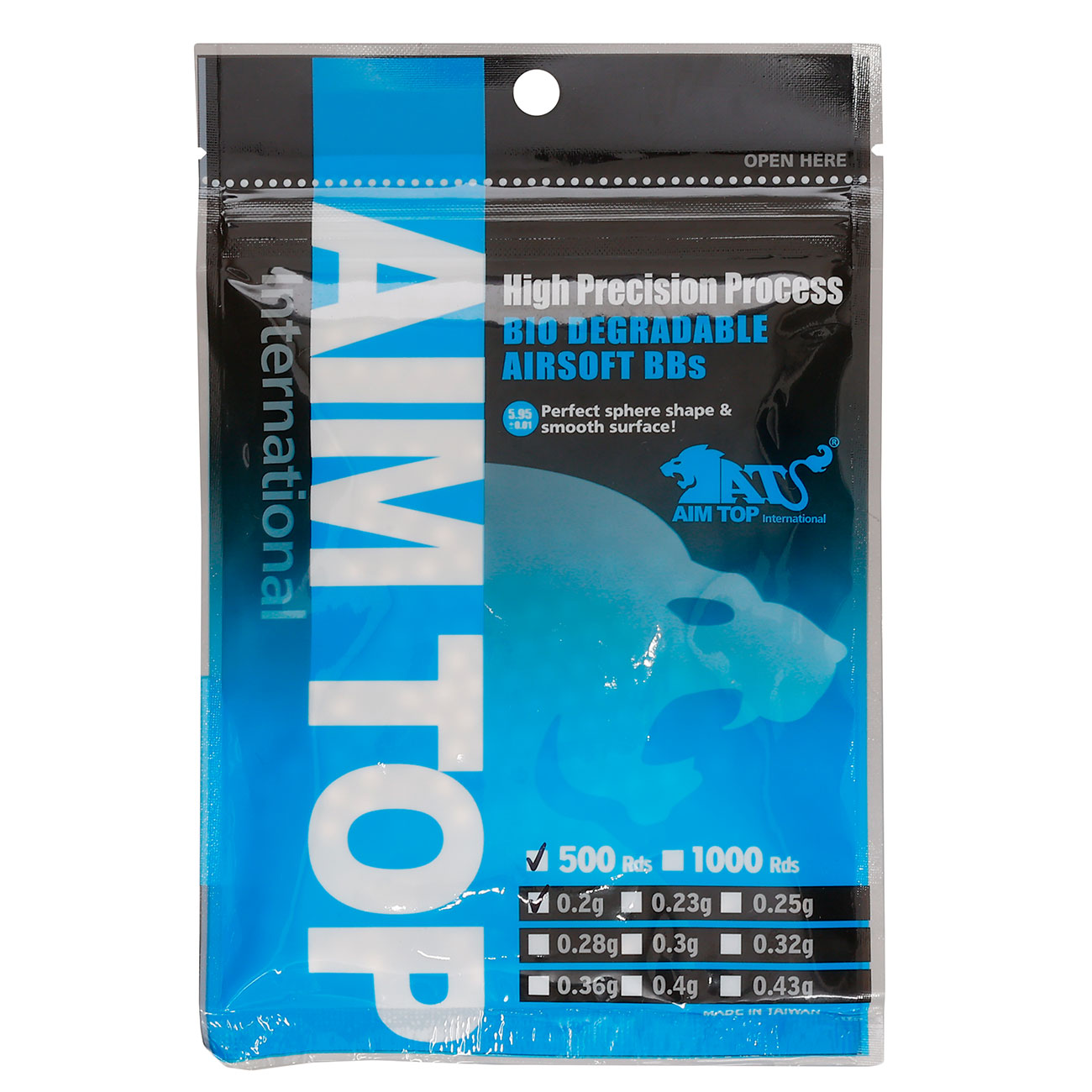 Die Bio-Degredable 6mm BBs von AIM Top sind aus einem speziellen und umweltfreundlichen Material hergestellt. Durch die organische Zusammensetzung werden die Kugeln mit der Zeit vollständig durch Umwelteinflüsse wie z.B. Regen, Sonneneinstrahlung, Wärme usw. abgebaut. Dank dieser Eigenschaft müssen die BBs nicht mehr vom Boden aufgelesen werden.