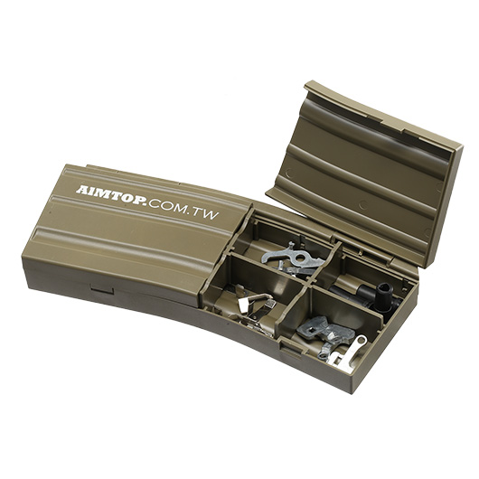 Die Sortierbox oder Accessory-Box von AIM Top und Evike besitzt das Aussehen sowie auch die Formgröße eines M4 / AR-15 Magazines. Dank dieser Eigenschaft, kann die Box in sämtliche Magazintaschen untergebracht werden. Gefertigt ist die Sortierbox aus stabilem Verbundkunststoff und somit sehr robust.