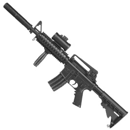 Das einsteigerfreundliche airmaX M4 in der Sport Series kommt mit 6-fach ausziehbarem Schiebeschaft im Maßstab 1/1. Für eine schnelle Schussfolge sorgt der AEG Schussantrieb, bei dem ein Motor das Nachspannen übernimmt. Somit muss nicht per Hand nachgespannt werden und das Gewehr kann halb- und vollautomatisch im Kaliber 6mm BB Schießen. Weiterhin ist dieses Modell mit einem RIS - Schienensystem bestückt wodurch sehr viele Zubehörteile für 20 - 22mm Schienen angebracht werden können, z.B. die enthaltenen Rail-Covers.
