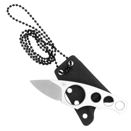 Der ergonomisch geformte Griff in Skelettbauweise besitzt ein 26 mm Zeigefingerloch und bietet neuartige Handhabungs- und Griffmöglichkeiten. Mit der im Lieferumfang enthaltenen Kydexscheide und der Kugelkette lässt sich das Amare Knive A-Max angenehm und verdeckt um den Hals tragen.