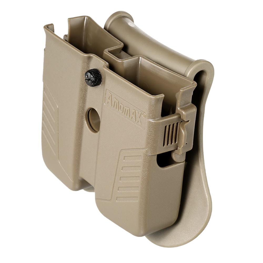 Das Magazinholster wurde von Amomax universell konstruiert. Es können daher diverse Single- oder Double-Stack (ein- oder zweireihige Magazine) im Holster eingesetzt werden. Durch die Handschraube in der Mitte und die beiden Rastenversteller an den beiden Außenseiten, kann das Holster an das jeweilige Magazin angepasst werden. Jedes der beiden Fächer ist mit einer automatischen Klemmvorrichtung versehen, damit das Magazin nicht ungewollt herausfallen kann.