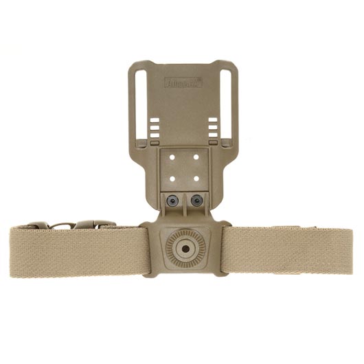 Die Befestigung eines Holsters oder einer Magazintasche an der Beinplattform erfolgt durch eine im Lieferumfang des jeweiligen Holsters bzw. der jeweiligen Magazintasche enthaltenen Schraube mit Mutter.