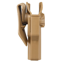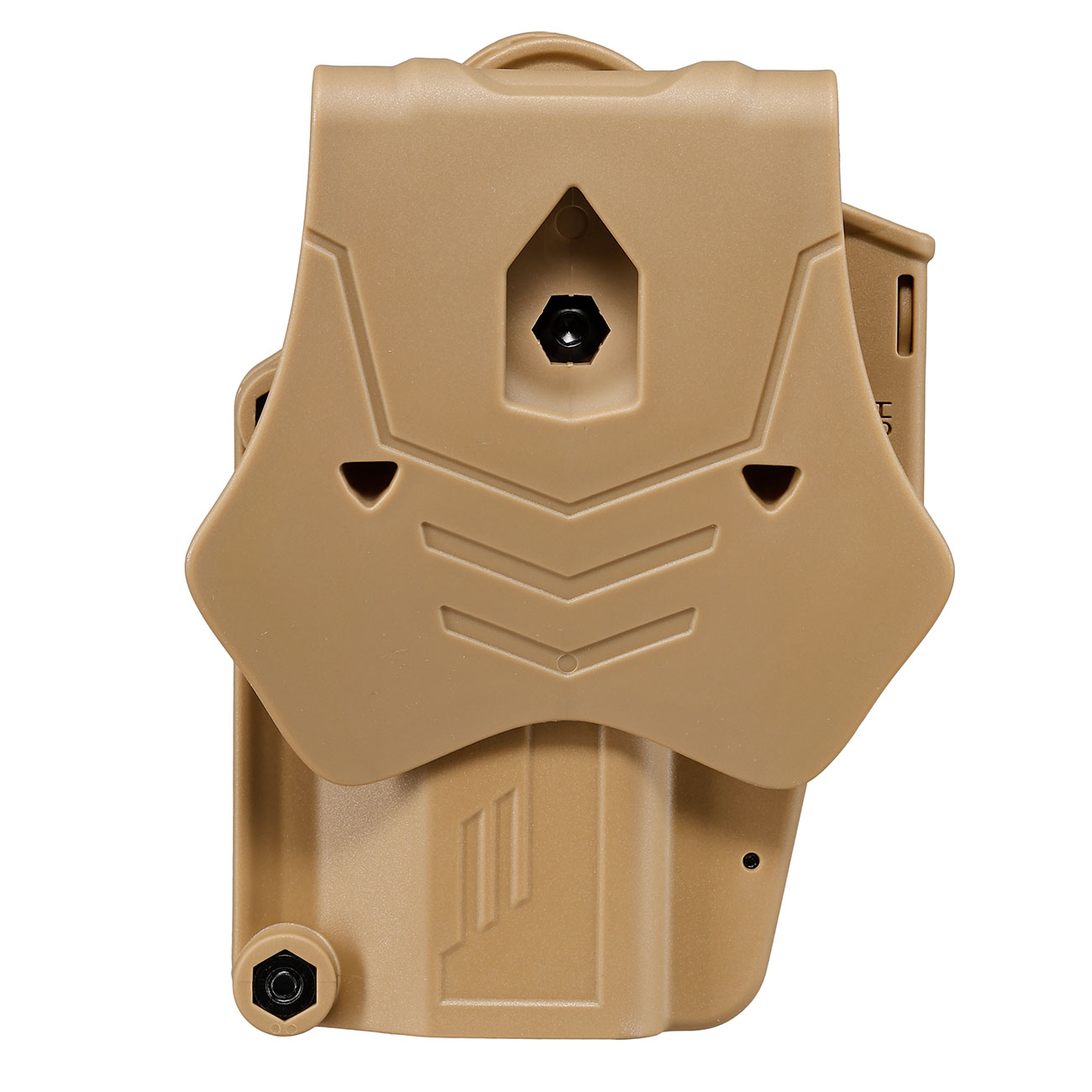 Amomax ist ein sehr bekannter Holster sowie Tragegurt Hersteller und ist in den Bereichen Sportschießen, Jagen, Militär und auch Airsoft aktiv. Sämtliche Passform-Holster werden von Amomax aus speziellen Polymer-Verbundkunststoff hergestellt. Dieses Material sorgt für ein besonders geringes Gewicht, bei gleichzeitig sehr hoher Stabilität. Neben dem eigentlichen Passform-Holster ist im Lieferumfang auch ein sogenanntes Paddle enthalten. Mit dieser Befestigung kann das Holster einfach am Gürtel oder der Hose angebracht werden. Es können Gürtel mit bis zu 50 mm Breite mit dem Holster verwendet werden.