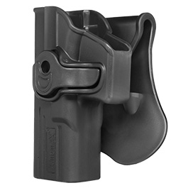 Amomax ist ein sehr bekannter Holster sowie Tragegurt Hersteller und ist in den Bereichen Sportschießen, Jagen, Militär und auch Airsoft aktiv. Sämtliche Passform-Holster werden von Amomax aus speziellen Polymer-Verbundkunststoff hergestellt. Dieses Material sorgt für ein besonders geringes Gewicht, bei gleichzeitig sehr hoher Stabilität. Neben dem eigentlichen Passform-Holster ist im Lieferumfang auch ein sogenanntes Paddle enthalten. Mit dieser Befestigung kann das Holster einfach am Gürtel oder der Hose angebracht werden. Es können Gürtel mit bis zu 50 mm Breite mit dem Holster verwendet werden.