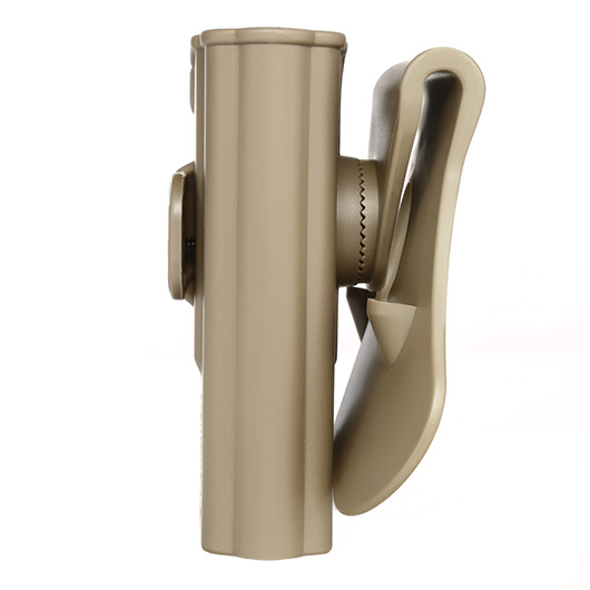 Zusätzlich ist das Holster mit praktischen Funktionen ausgestattet: So lässt es sich einfach in neun Grad Schritte um insgesamt 360 Grad drehen und an der gewünschten Position fixieren. Hierzu muss einfach die angebrachte Schraube mit dem beiliegenden Innensechskantschlüssel gelöst und nach dem Einstellvorgang wieder festgedreht werden. Das Holster kann so für sämtliche Wettbewerbe oder Vorlieben angepasst werden.