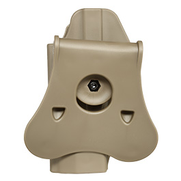 Zusätzlich ist das Holster mit praktischen Funktionen ausgestattet: So lässt es sich einfach in neun Grad Schritte um insgesamt 360 Grad drehen und an der gewünschten Position fixieren. Hierzu muss einfach die angebrachte Schraube mit dem beiliegenden Innensechskantschlüssel gelöst und nach dem Einstellvorgang wieder festgedreht werden. Das Holster kann so für sämtliche Wettbewerbe oder Vorlieben angepasst werden.