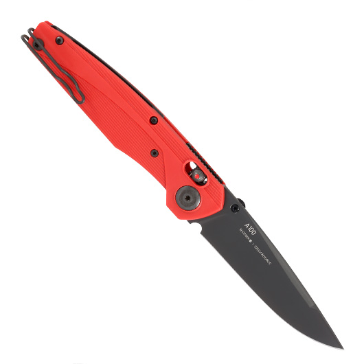 Das aus extrem widerstandsfähigen GRN-Polymer gefertigte Griffstück verleiht dem A100 eine hohe Festigkeit bei einem unglaublich niedrigen Gewicht. Dank der Kehlung in der Griffoberfläche liegt das Messer gut in der Hand. Als optisches Highlight werden die Griffschalen von einem sehr stabilen GRN-Polymer-Abstandshalter in Rot zusammengehalten. Am Ende des Abstandshalters befindet sich ein verstecktes Loch für ein optionales Lanyard. Ein Deep Carry Gürtelclip, der umsetzbar und schwarz beschichtet ist, rundet dieses schöne Einhandmesser ab.