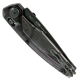 Das aus extrem leichten Ultem Komposit-Polymer gefertigte Griffstück verleiht dem A100 ein gute Festigkeit bei einem unglaublich niedrigen Gewicht. Dank der Kehlung in der Griffoberfläche liegt das Messer gut in der Hand. Die Griffschalen werden für mehr Ergonomie von einem sehr stabilen GRN-Polymer-Abstandshalter zusammengehalten. Am Ende des Abstandshalters befindet sich ein verstecktes Loch für ein optionales Lanyard. Ein Deep Carry Gürtelclip, der umsetzbar und schwarz beschichtet ist, rundet dieses schöne Einhandmesser ab.