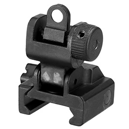 Aus Aluminium gefertigtes Flip-Up Rear Sight von APS Airsoft in authentischem Battle Folding Style. Das hintere Zielvisier kann wahlweise aus- oder eingeklappt werden. Ein ungewolltes aus- oder einklappen verhindert dabei ein Rasten-Mechanismus. Weiterhin kann das Zielvisier in der Höhe und auch seitlich verstellt werden - zusätzlich stehen zwei Absehen zur Verfügung. Dank der seitlichen Handmutter kann das Visier leicht angebracht bzw. abgenommen werden.