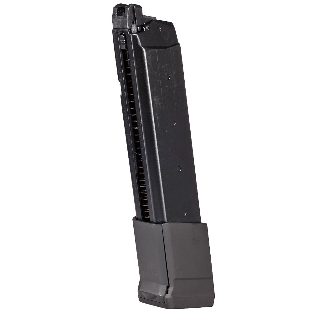An sich handelt es sich beim Magazin um die Extended Softairgas-Ausführung mit einer Kapazität für bis zu ca. 34 6mm BB Kugeln. Der Gastank befindet sich im Innern des Magazins. Zum Befüllen muss lediglich die Bodenplatte nach hinten abgeschoben werden. Durch die starke High Tension Feder sowie dem verbesserten Magazin-Follower im Innern, ist das Magazin mit sehr guten Feeding-Eigenschaften ausgestattet.