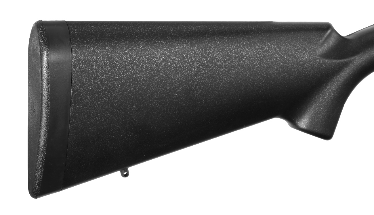 Für den Schaft verwendet APS Airsoft ein spezielles Verbundkunststoffmaterial, das einen stabilen Eindruck hinterlässt und sehr gut verarbeitet ist. An sich besitzt der Schaft ein schmales sowie glattes Design, welches sich im vorderen Bereich verjüngt. Dank dieser Eigenschaft und den Konturen im Griffbereich lässt sich das Gewehr sehr gut halten. Im hinteren Bereich ist der Schaft als Pistolenschaft mit ausgestellter Backe hergestellt. Am Schaftende wurde eine gummierte Schaftkappe angebracht. Der Schaft kommt in schwarz-grauer Farbgebung und ist mit einer leichten silbernen Sprenkelung versehen. Die Farbwahl des Schafts wurde speziell gewählt und kommt dem Original sehr nahe.