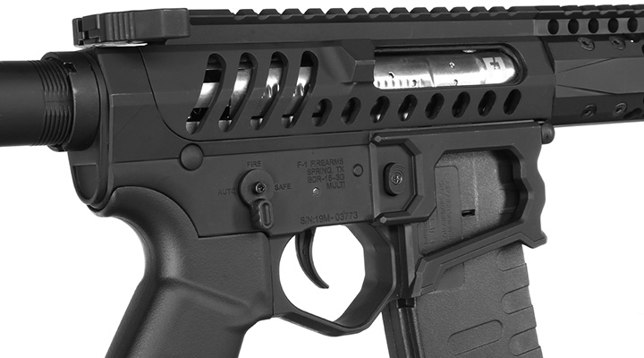 Ein sehr auffälliges Merkmal der BDR-15 3G in der PDW Version ist das spezielle Hauptgehäuse im Skeletonized Design. Auch dieses Gewehrteil wurde von APS Airsoft detailliert nach den Spezifikationen des Originals nachgefertigt. Wie beim Handguard kommt hier ebenfalls das CNC-Herstellungsverfahren zum Einsatz, wodurch eine hervorragende Passgenauigkeit gewährleistet ist. Besonders die vielen Cut-Outs (Ausfräsungen) an beiden Gehäuseteilen sorgen für eine perfekte Skelett-Optik. Neben dem coolen Design wird vor allem das Gewicht des Gewehrs um ein ganzes Stück reduziert. Als praktischer Nebeneffekt kann auch die im Innern befindliche Gearbox und das Hop-Up System mit Magazin von Außen betrachtet werden. Auf den Gehäuseteilen wurden von APS Airsoft die originalen Schriftzüge und Logos tief eingraviert - siehe Fotos. Der Feuerwahlhebel ist, wie beim Original, im beidseitigen Design vorhanden. Im oberen Bereich des Hauptgehäuses findet sich die typische 21mm Schiene um z. B. ein Zielgerät aus dem Zubehörmarkt montieren zu können. Hier wurde auch das F-1 Firearms Logo eingraviert. Hinter der Schiene ist ein beidseitig bedienbarer Spannhebel im interessanten Match-Design angebracht - auch hier findet sich ein F-1 Firearms Logo.
