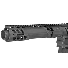 Das Frontsystem kommt bei diesem Airsoftgewehr mit einem montierten, einteiligen ca. 7,5 Zoll Aluminium-Außenlauf. An der Vorderseite des Laufes aufgeschraubt ist eine lizenzierte Airsoftreplika des beliebten Noveske KX3 Sound Amplifiers. Diese ist ebenfalls komplett aus Aluminium gefertigt und mit dem gängigen 14mm Linksgewinde versehen. Der Handguard kommt bei diesem Gewehr im lizenzierten F-1 Firearms C7M Design aus Aluminium und besitzt eine Länge von ca. 9,8 Zoll. Gefertigt ist dieser natürlich im CNC-Herstellungsverfahren, wodurch eine sehr gute Passgenauigkeit und Gleichheit zum Original gesichert ist. Durch das moderne M-LOK Montagesystem im vorderen Bereich mit drei Winkeln, können diverse Zubehörteile angebracht werden - z. B. ein Frontgriff oder Adapterschienen (siehe Zubehörmarkt). Weiterhin befindet sich links, rechts sowie vorne und hinten am C7M Handguard eine Öffnung für eine QD-Tragegurthalterung (nicht enthalten). Die obenliegende 21mm Schiene besitzt eine Länge von ca. 248 mm und geht direkt in das Hauptgehäuse über, wodurch diverse Zielgerätkombinationen ohne Probleme angebracht werden können. Aufgrund der speziellen Formgebung des Handguards lässt sich das Gewehr besonders sicher und ruhig halten. Ein Vorteil, wenn es um das schnelle Anvisieren von Zielen geht.