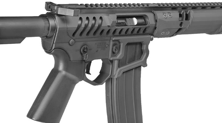 Ein weiteres sehr auffälliges Merkmal der BDR-15 3G in der SBR Version ist das spezielle Hauptgehäuse im Skeletonized Design. Auch dieses Gewehrteil wurde von APS Airsoft detailliert nach den Spezifikationen des Originals nachgefertigt. Wie beim Handguard kommt hier ebenfalls das CNC-Herstellungsverfahren zum Einsatz, wodurch eine hervorragende Passgenauigkeit gewährleistet ist. Besonders die vielen Cut-Outs (Ausfräsungen) an beiden Gehäuseteilen sorgen für eine perfekte Skelett-Optik. Neben dem coolen Design wird vor allem das Gewicht des Gewehrs um ein ganzes Stück reduziert. Als praktischer Nebeneffekt kann auch die im Innern befindliche Gearbox und das Hop-Up System mit Magazin von Außen betrachtet werden. Auf den Gehäuseteilen wurden von APS Airsoft die originalen Schriftzüge und Logos tief eingraviert - siehe Fotos. Der Feuerwahlhebel ist, wie beim Original, im beidseitigen Design vorhanden. Im oberen Bereich des Hauptgehäuses findet sich die typische 21mm Schiene, um z. B. ein Zielgerät aus dem Zubehörmarkt montieren zu können. Hier wurde auch das F-1 Firearms Logo eingraviert. Hinter der Schiene ist ein beidseitig bedienbarer Spannhebel im interessanten Match-Design angebracht - auch hier findet sich ein F-1 Firearms Logo.