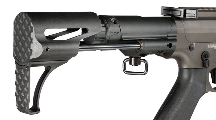 Hinten ist eine spezielle Schaftkonstruktion mit der Bezeichnung CRS angebracht. Der Schiebeschaft läuft auf zwei starken Stahlstegen und besitzt vier Einrastpositionen. Beide Führungsstege sind federgelagert, wodurch der Schaft sofort ausfährt, sobald die Arretierung gedrückt wird. Dank Strukturierung an der Schaftkappe liegt das Gewehr beim Schießen sehr gut im Anschlag. Zusätzlich befindet sich eine Verlängerung für die Schaftkappe im Lieferumfang - diese erhöht den Komfort beim Führen im Anschlag. Als Akkufach dient das kleine Gehäuse hinter dem Hauptgehäuse. Durch einen QD-Pin kann das Akkufach geöffnet und der Akku dadurch schnell gewechselt werden. Das Akkufach besitzt die Größe von ca. 117 x 32 x 31 cm. In das Akkufach können 7.4V - 11,1V LiPo Akkus eingelegt werden (passender Akku siehe Zubehör). Als Anschlussstecker ist ein T-Stecker / Deans angebracht - bitte dies beim Akkukauf beachten!