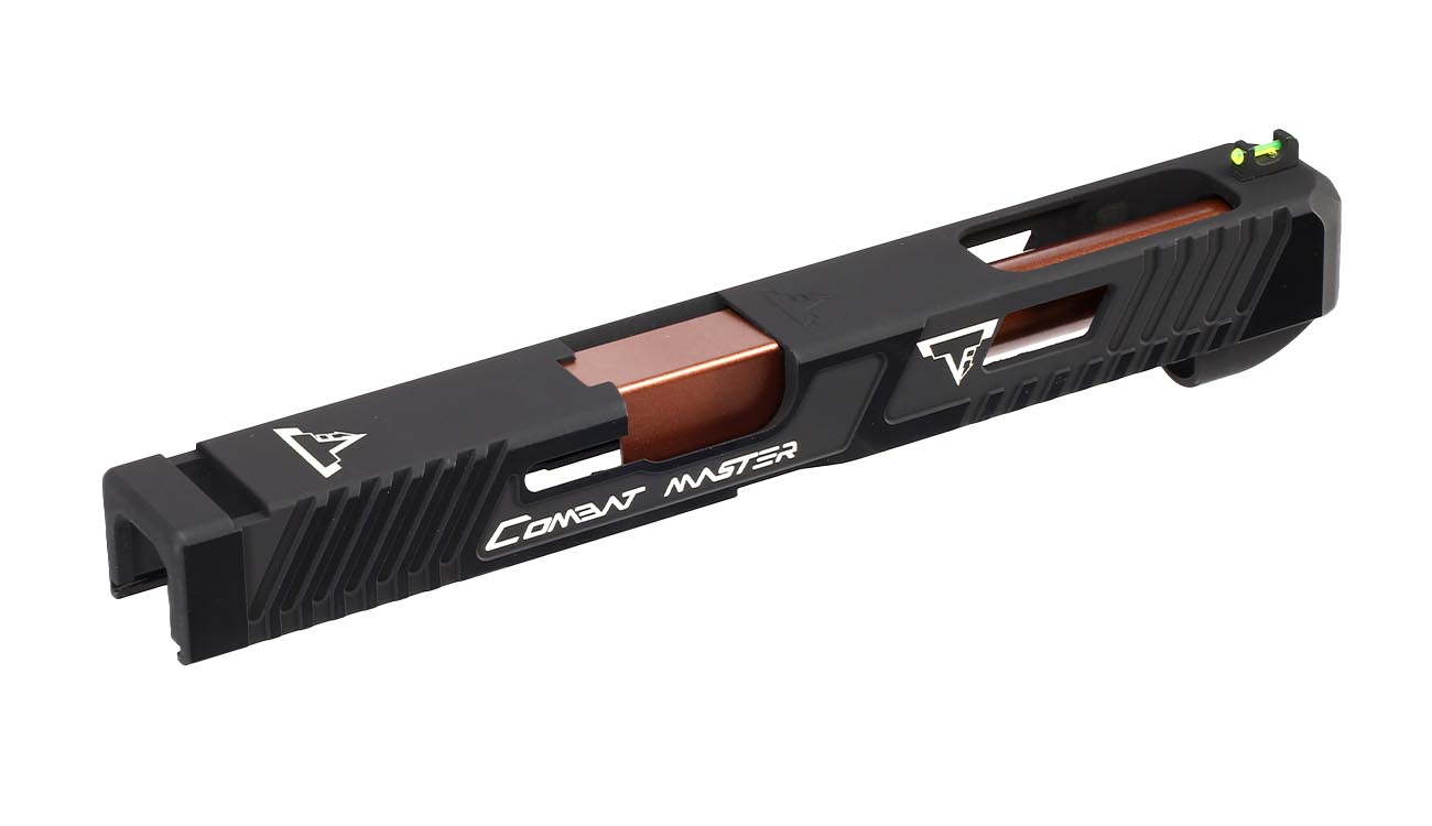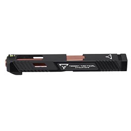 Wie bereits erwähnt, kommt das TTI Schlitten Set von APS / EMG komplett inklusiv passendem Außenlauf im authentischen kupferfarbenen Finish und 14mm+ Rechts-Innengewinde. Beide Teile sind passgenau aus stabilem Aluminium gefertigt. Besonders detailliert hergestellt ist beim Kit der Schlitten im matt- und glänzenden Finish mit eingelaserten sowie eingravierten TTI-Logos / -Beschriftungen. Das vordere grüne Fiber-Optik Visier ist am Schlitten bereits montiert. Passend hierzu befindet sich auch noch das nötige hintere Visier im Lieferumfang.