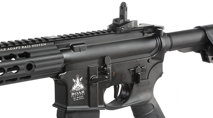 Das Frontsystem kommt bei dieser Ausführung aus der ASR Serie mit einem einteiligen 10 Zoll Aluminium-Außenlauf ausgestattet. Der darauf aufgeschraubte UAR Flash-Suppressor ist ca. 105 mm lang und besteht ebenfalls komplett aus Aluminium (14mm Linksgewinde). Interessant ist an dieser Stelle, dass der Innenlauf des Gewehrs, bis an das Ende des Flash-Hiders geht. Somit wurde bei diesem Gewehr jeglicher Platz genutzt um den Innenlauf so lange wie möglich zu machen. Der Handguard kommt bei diesem Gewehr im Low Profile Adapt Rail System und besitzt eine Länge von 12,5 Zoll. Natürlich ist das System komplett aus Aluminium gefertigt. Sehr interessant ist die Optik an der Vorderseite im aggressiven Wirecut-Design. Durch das moderne KeyMod Montagesystem mit sieben Winkeln, können diverse Zubehörteile angebracht werden - z. B. die drei enthaltenen 21mm Adapterschienen mit einer Länge von jeweils ca. 114 mm. Links und rechts ist auch jeweils eine Aussparung für eine QD-Tragegurthalterung vorhanden. Die obenliegende 21mm Schiene besitzt eine Länge von ca. 314 mm und ist ab Werk mit einem Flip-Up Fiber-Optik Zielvisier im sogenannten Athena Design ausgestattet. Das Visier kann im ein- und ausgeklappten Zustand verwendet werden. Auch ein komplettes Abnehmen ist möglich.