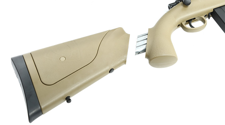 Beim Schaft des APS M40A3 Airsoftnachbaus handelt es sich um eine Polymer-Verbundkunststoff Konstruktion. Diese ist im vorderen Bereich mit einer rauen Strukturierung versehen, wodurch ein sicherer Halt gewährleistet ist. Am vorderen unteren Bereich befindet sich eine Aufnahme für ein Zweibein. Das hintere Griffstück ist ebenfalls strukturiert und daher sehr griffig. Die Schulterstütze an der Hinterseite ist mit einer Hartgummi-Schulterauflage ausgestattet. In die Auflage wurde das Hakkotsu-Logo eingegossen, welches gleichzeitig als rutschhemmende Struktur dient. Die Wangenauflage ist bei diesem Snipergewehr durch vier Stufen, um bis zu 30 mm, in der Höhe verstellbar. Für den Einstellvorgang muss lediglich das APS-Logo im Bereich der Wangenauflage gedrückt werden. Auch diese Auflage ist mit einer Strukturierung versehen, damit das Gewehr sicher im Anschlag liegt. Um den Transport des Gewehrs zu vereinfachen, kann die Schulterstütze vom Gewehr getrennt werden. Dank eines durchdachten Systems, geschieht dies einfach durch das Drücken eines Knopfes.