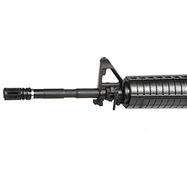 Das Frontsystem ist bei dieser Ausführung mit einem einteiligen 14.5 Zoll Aluminium-Außenlauf ausgestattet. Der darauf aufgeschraubte Flash-Hider besteht, wie auch das feste höhenverstellbare Frontvisier, komplett aus Aluminium. Unterhalb des Frontvisiers befindet sich eine Metall-Tragegurthalterung. Da es sich um die Standard M4A1 Carbine Version handelt, ist der Handguard originalgetreu aus Verbundkunststoff hergestellt. Unter dem Handguard befindet sich das Akkufach für den Antriebsakku. Es können diverse Akkutypen eingesetzt werden - siehe Zubehör (z. B. 9.6V NiMH Twin-Type / V-Shaped-Type, ... Akkus). Der Akkuanschluss ist mit einem gängigen Mini-Tam Stecker versehen.