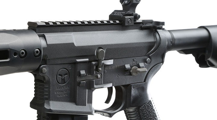 Das Hauptgehäuse ist wie bei den anderen Amoeba Gewehren aus widerstandsfähigem Nylonfiber hergestellt. Durch die matt-schwarze Färbung und die originalgetreue Oberflächenbeschaffenheit ist eine authentische Optik gewährleistet. Neben dem coolen Amoeba Logo und Schriftzug ist auch das Kaliber mit fortlaufender Seriennummer in das Gehäuse eingegossen. Die beiden Gehäusehälften des Hauptgehäuses sind sehr passgenau gefertigt und sitzen fest aufeinander. Auch die anderen Teile des Gewehrs sind spielfrei montiert und sauber verarbeitet. Das über dem Hauptgehäuse montierte und aus überwiegend Kunststoff gefertigte Battle Sight Zielvisier, kann seitlich verstellt werden und verfügt über zwei Absehen. Auch ein komplettes abnehmen des Visiers ist möglich. Die darunter befindliche 21mm Schiene eignet sich auch ideal für diverse andere Zielgeräte aus dem Zubehör. Der taktische Griff mit angerauten Flächen sorgt für einen sicheren Halt und ist ebenfalls aus nylonverstärktem Kunststoff hergestellt.