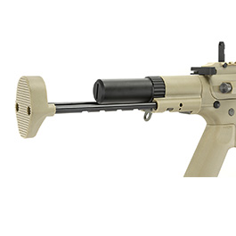 Der hintere Bereich der AMM5 Variante aus der Ares Airsoft Amoeba Mutant Series ist mit einer Schaftkonstruktion im PDW-Style ausgestattet. Der Schiebeschaft läuft auf zwei starken Stahlstegen und besitzt fünf Einrastpositionen. Die sehr klein gehaltene Schaftkappe ist hingegen aus Polymer-Verbundkunststoff gefertigt und mit einer rutschhemmenden Rillenstruktur versehen. Arretiert wird der Schaft von unten, hier ist auch eine Tragegurtöse integriert. Als Akkufach dient das Gehäuse in der Mitte des Schaftes an dem auch die Schaftarretierung angebracht ist. Geöffnet wird das Akkufach durch einen Schraubverschluss, wodurch der Akku schnell und werkzeugfrei gewechselt werden kann. In das Akkufach können 7.4V / 11,1V LiPo Akkus mit einer Länge bis zu ca. 135 mm eingelegt werden (siehe Zubehör). Beim Akkuanschlusskabel handelt es sich um eine T-Stecker / Deans Ausführung - dies bitte beim Akkukauf beachten!
