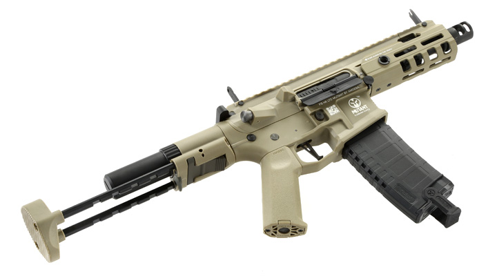 Das Airsoftgewehr mit der Bezeichnung AMM5 aus der Ares Airsoft Amoeba Mutant Series stellt die bisher kürzeste Variante dar und ist dadurch perfekt für PDW- oder CQB-Einsätze gedacht. An der Vorderseite ist das Gewehr mit einem sehr kurzen, ca. 4,7 Zoll langen Aluminium-Außenlauf augestattet. Der aufgeschraubte Flash-Hider im interessanten Design kommt dagegen komplett aus Stahl und ist mit einem 14mm Rechtsgewinde versehen. Beim Handguard handelt es sich um eine spezielle und sehr kurze Variante aus dem Mutant Series Programm von Ares Airsoft. Das System besteht komplett aus Aluminium und besitzt eine Länge von ca. 127 mm. An die M-LOK kompatiblen Öffnungen an den Seiten sowie im unteren Bereich können diverse M-LOK Zubehörteile angebracht werden. Die Oberseite ist mit einer kurzen 21 mm Schiene versehen, die zusätzlich mit einem innenliegenden Flip-Up Visier ausgestattet ist. Links und rechts kann am Handguard auch noch eine QD-Tragegurthalterung eingesetzt werden (nicht enthalten).