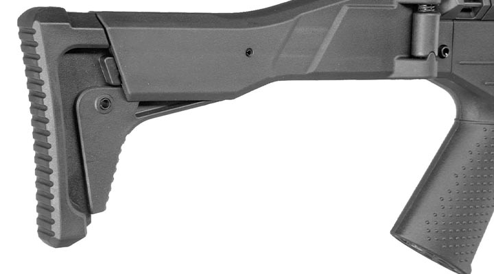 Der Klappschaft kann wahlweise nach rechts weggeklappt werden und ist wie das Gehäuse aus Polymer-Verbundkunststoff hergestellt. Zusätzlich ist der Schaft weiterhin noch 3-fach in der Länge verstellbar und besitzt eine strukturierte Schaftkappe für den sicheren Halt im Anschlag.