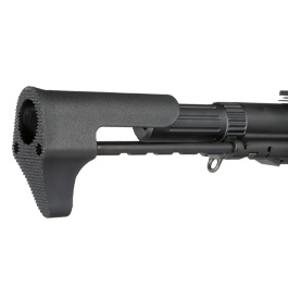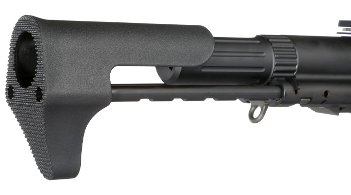 Hinten ist eine spezielle Schaftkonstruktion AM-ES-03 im PDW-Style angebracht. Der Schiebeschaft läuft auf zwei starken Stahlstegen und besitzt 5 Einrastpositionen. Die Schaftkappe wurde von Ares Airsoft aus stabilem Polymer-Verbundkunststoff gefertigt und kommt mit integrierter Wangenauflage sowie rutschhemmender Struktur an der Hinterseite. Diese positive Eigenschaft sorgt für einen hervorragenden Sitz des Gewehrs im Anschlag. Als Akkufach dient das Gehäuse in der Mitte des Schaftes an dem auch die Schaftarretierung angebracht ist. Geöffnet wird das Akkufach durch einen Schraubverschluss an der Hinterseite, wodurch der Akku schnell gewechselt werden kann. In das Akkufach können 7.4V / 11,1V LiPo Akkus mit einer Länge bis zu ca. 130 mm eingelegt werden (siehe Zubehör). Beim Akkuanschlusskabel handelt es sich um eine T-Stecker / Deans Ausführung - dies bitte beim Akkukauf beachten!