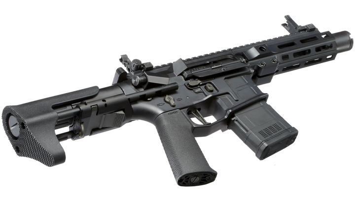 Mit dem Model 6 bringt Ares Airsoft ein kurzes Gewehr auf den Markt, das sich in der Länge perfekt für PDW- oder CQB-Einsätze eignet. An der Vorderseite ist das Gewehr mit einem kurzen ca. 5,7 Zoll langen Aluminium-Außenlauf augestattet, auf dem ein Gas-Block und Deko-Gasgestänge montiert ist. Der Lauf kommt im interessanten Fluted-Design und ist an der Vorderseite mit einem aufgeschraubten Stahl Flash-Hider versehen. Das Short-Amplifier Design sorgt beim Schießen für einen auffälligen Sound und dank 14mm Rechtsgewinde kann dieser wahlweise auch gegen einen Silencer aus dem Zubehörmarkt getauscht werden. Beim Handguard handelt es sich um eine spezielle und kurze ca. 6,1 Zoll Variante aus Aluminium, die mit einer Schnellwechselfunktion ausgestattet ist. Werden die beiden unten angebrachten Stahl-Schrauben gelöst, kann der Handguard einfach nach vorne abgezogen werden. Der Handguard selbst ist mit M-LOK kompatiblen Öffnungen versehen, wodurch an 7-Winkeln diverse M-LOK Zubehörteile angebracht werden können. Praktisch, links und rechts kann am Handguard auch noch eine QD-Tragegurthalterung eingesetzt werden (nicht enthalten). Die Oberseite ist mit einer 21 mm Schiene versehen, die in die Schiene des Hauptgehäuses übergeht. Es ergeben sich somit ca. 316 mm für die Montage eines Zielgerätes. Auf der Schiene ist im vorderen Bereich ab Werk ein Aluminium Flip-Up Visier angebracht. Das Visier kann im ein- und ausgeklappten Zustand verwendet werden. Auch ein komplettes Abnehmen ist möglich.
