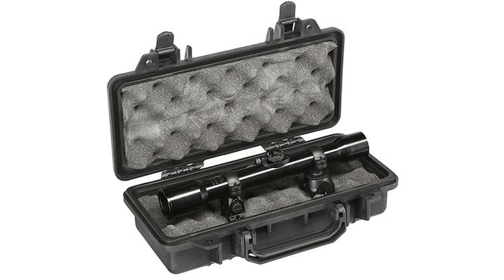 Um das hochwertige Zielfernrohr bei Nichtgebrauch sicher verstauen zu können, wird dieses in einem stabilen Koffer geliefert. Der kleine Koffer ist aus robustem Polymer-Verbundkunststoff gefertigt und im Innern mit Wabenschaumstoff ausgekleidet. Wahlweise können auch Schlösser aus dem Zubehör angebracht werden.