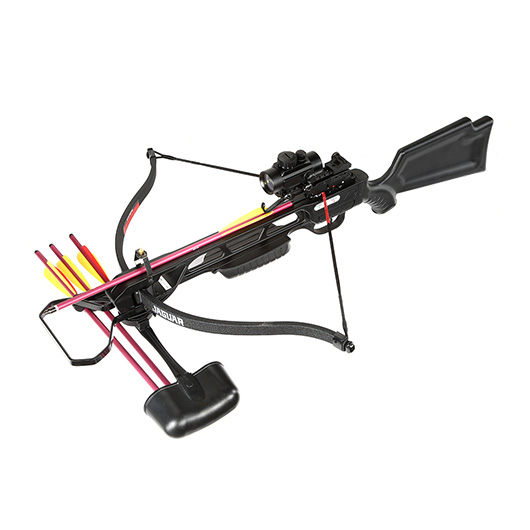 Die Recurve Armbrust Jaguar besteht aus einem robusten Kunststoff-Körper und bringt es auf eine Leistung von 175 lbs Zuggewicht. Um Optiken oder Zieleinrichtungen anzubringen, ist die Armbrust mit einer 22 mm Prismenschiene ausgestattet. Durch die Metallfußschlaufe lässt sich die Armbrust komfortabel spannen.