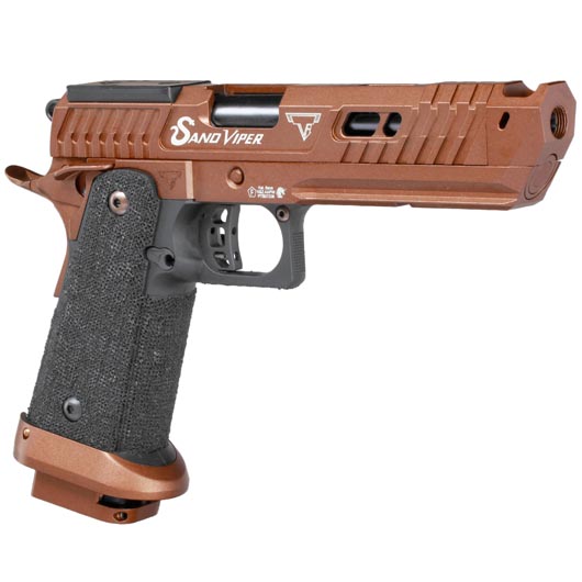 Mit der Sand Viper bringt Army Armament in Verbindung mit Jag Precision eine weitere von TTI lizenzierte GBB-Airsoftpistole auf den Markt. Wie bereits erwähnt, handelt es sich wieder um eine Replika auf Basis der populären 2011er Hi-Capa Serie. Auch diese Pistole steht dem scharfen Pistolenvorbild optisch in keinster Weise nach. Vor allem die Lizenz des Originalherstellers Taran Tactical Innovations - kurz TTI - sorgt hier wieder für eine besonders authentische und hochdetaillierte Airsoftpistole, die für Sammler und Spieler zugleich sehr interessant ist. Großen Bekanntheitsgrad erhielt die scharfe Sand Viper durch den Sieg der ersten USPSA 2-Gun Nationals im Jahr 2021. Die Pistole von TTI, auch liebevoll als 'Sickest Serpent on the Planet' bezeichnet, ist mit versteckten Reißzähnen ausgestattet - allerdings nur beim scharfen Pendant. TTI liefert mit der Sand Viper eine bemerkenswerte Handfeuerwaffe ab, die optisch und leistungstechnisch vollends überzeugt.
