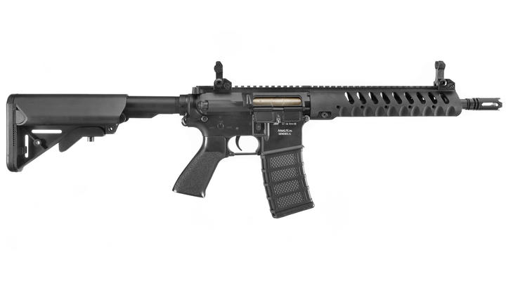 Für Stabilität sorgt bei diesen, von Classic Army hergestellten, ASG Sportline Modell ein einteiliger 10,5 Zoll Aluminium Außenlauf mit abnehmbarem sowie aggressiven Stahl Flash-Hider. Anstatt des üblichen Standard Handguards, ist bei diesem Light Tactical Carbine ein spezielles Modell verbaut. Gefertigt ist der Custom Handguard aus Polymer-Verbundkunststoff und seitlich mit Montagelöchern versehen. Diese dienen zur Befestigung der beiden enthaltenen 60mm langen 21mm Schienen, welche wahlweise platziert werden können. An der Unterseite ist das mittlerweile gängige KeyMod Befestigungssystem angebracht um z. B. einen Frontgriff montieren zu können. Bei der obenliegenden Schiene handelt es sich um eine Standard 21mm Ausführung. Da das Frontsystem exakt am Hauptgehäuse anliegt, verlängert sich die obenliegende Schiene um ca. 248 mm - ideal für die Montage eine Zielgeräts oder einer Zielgerät-Combo aus dem Zubehörmarkt. Bereits angebracht ist ein abnehmbares und höhenverstellbares Flip-Up Frontvisier aus Aluminium.