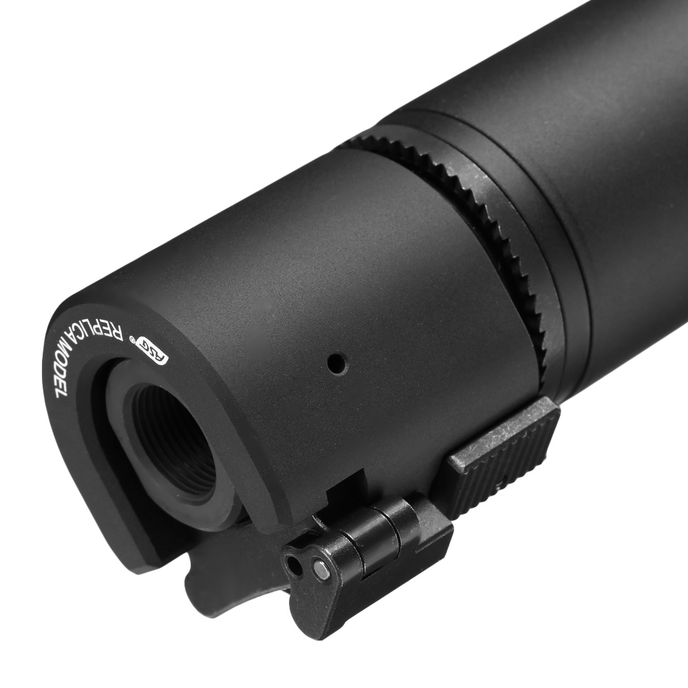 Die Brügger & Thomet AG mit Sitz in der Schweiz ist vor allem durch ihre populäre B&T 5 Maschinenpistole in der ganzen Welt bekannt. Der hier angebotene Silencer ist eine maßstabsgetreue Nachbildung des, ebenfalls von B&T hergestellten, Rotex-V Schalldämpfers aus Aluminium. Neben dem Silencer ist auch noch der passende Flash-Hider im Standard M4 Design im Lieferumfang enthalten. Dieser ist aus Stahl gefertigt und wirkt dadurch noch originalgetreuer. Dank dem gängigen 14mm- Linksgewinde, kann dieser auf vielen Außenläufen aufgeschraubt werden.