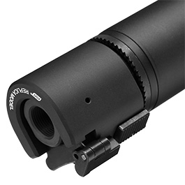 Diese Variante des Rotex-V kommt in der langen Standard Ausführung mit einer Gesamtlänge von ca. 197 mm. Die Lizenz von Brügger & Thomet sorgt dafür, dass sich sämtliche Originalmarkings auf dem Silencer befinden. Diese sind hochwertig und detailliert in das Material eingelasert, wodurch ein besonders authentischer Eindruck erweckt wird. Ein Highlight ist vor allem die hintere schwarze Schnellwechselvorrichtung, die dem Original sehr gut nachgefertigt wurde. Diese kommt aus CNC-gefrästem Aluminium, ist aber an den beanspruchten Stellen mit Stahlteilen aufgewertet. Eine Eigenschaft, die für maximale Stabilität im Einsatz sorgt. Dank der Vorrichtung kann der B&T Rotex-V Silencer einfach und schnell vom Gewehr abgenommen oder angebracht werden - eine wirklich durchdachte Konstruktion.