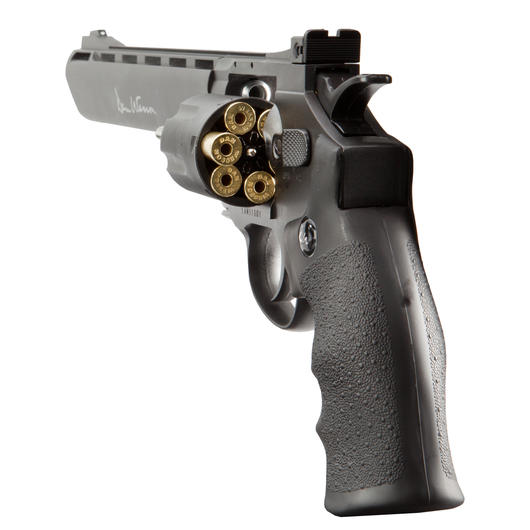 Das Laden des Revolvers kann authentischer nicht sein: Im Lieferumfang befinden sich 6 Messinghülsen in die jeweils eine 4,5mm Stahlrundkugel eingelegt wird. Danach werden die geladenen Hülsen einfach wie "echte" Patronen in die Trommel geschoben. Ebenfalls im Lieferumfang enthalten ist ein Schnelllader mit dem der Nachladevorgang erleichtert wird bzw. schneller durchgeführt werden kann. Nach dem schießen können die Hülsen wie beim Original Dan Wesson Revolver mithilfe der Ausstoßerstange herausgedrückt werden. Die Hülsen sind immer wieder verwendbar.