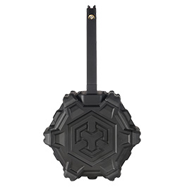 Durch die manuelle Konstruktion, werden für den Einsatz keine Batterien bzw. Akkus benötigt. Zuerst das Softairgas an der Unterseite des Magazins einfüllen. Aufgrund der Größe des Gastanks, kann dieser Vorgang im Gegensatz zu normalen Standard Magazinen mehrere Sekunden dauern. Danach einfach den Schieber auf der linken Seite öffnen und bis zu 350 6mm BB Rundkugeln in das Magazin einfüllen. Im Anschluss muss das Magazin nur noch an der Vorderseite über das große Spannrad aufgezogen werden - ähnlich wie bei Hi-Cap Magazine. Das Magazin ist jetzt bereit für den Einsatz! Kleines Gimmick - die Drehrichtung wird am Spannrad durch drei eingegossene Patronen-Silhouetten angezeigt.