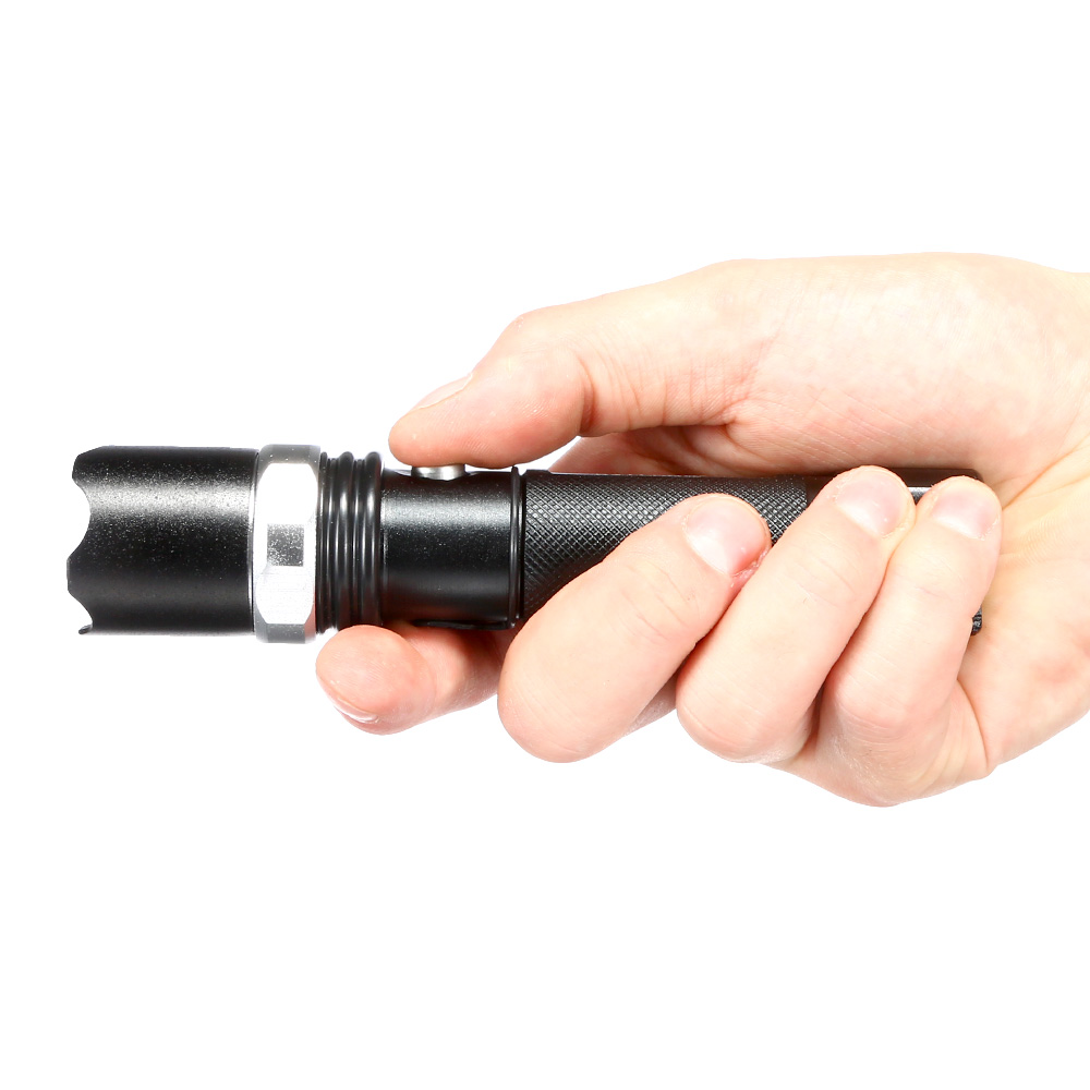 Die aus Aluminium bestehende, fokussierbare LED-Taschenlampe aus dem Hause Bailong erreicht eine maximale Leuchtweite von bis zu 400 Metern. Es können zwei Helligkeitsstufen eingestellt werden (100%, 50%). Als Zusatzfunktionen steht der Strobo Modus mit starker Blendwirkung für den Notfall zur Verfügung.