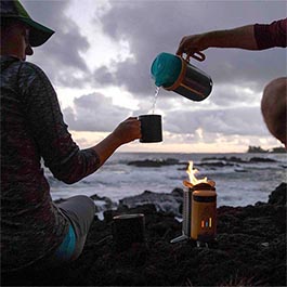 Das Complete Cook Kit von BioLite kommt mit dem CampStove 2+, ein stromerzeugender Holz-Camping Kocher, mit der KettlePot, ein Wasserkocher, Kochtopf und Kaffeekanne in einem, der CoffeePress, eine Kaffeepresse für die KettlePot und dem Portable Grill, ein Grillaufsatz für den CampStove 2+.