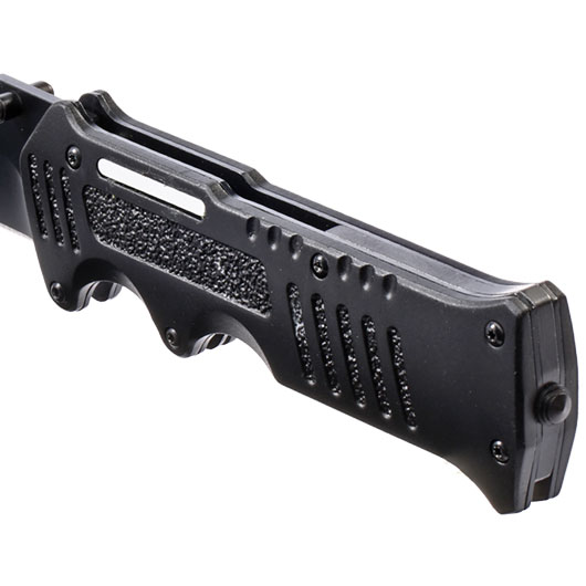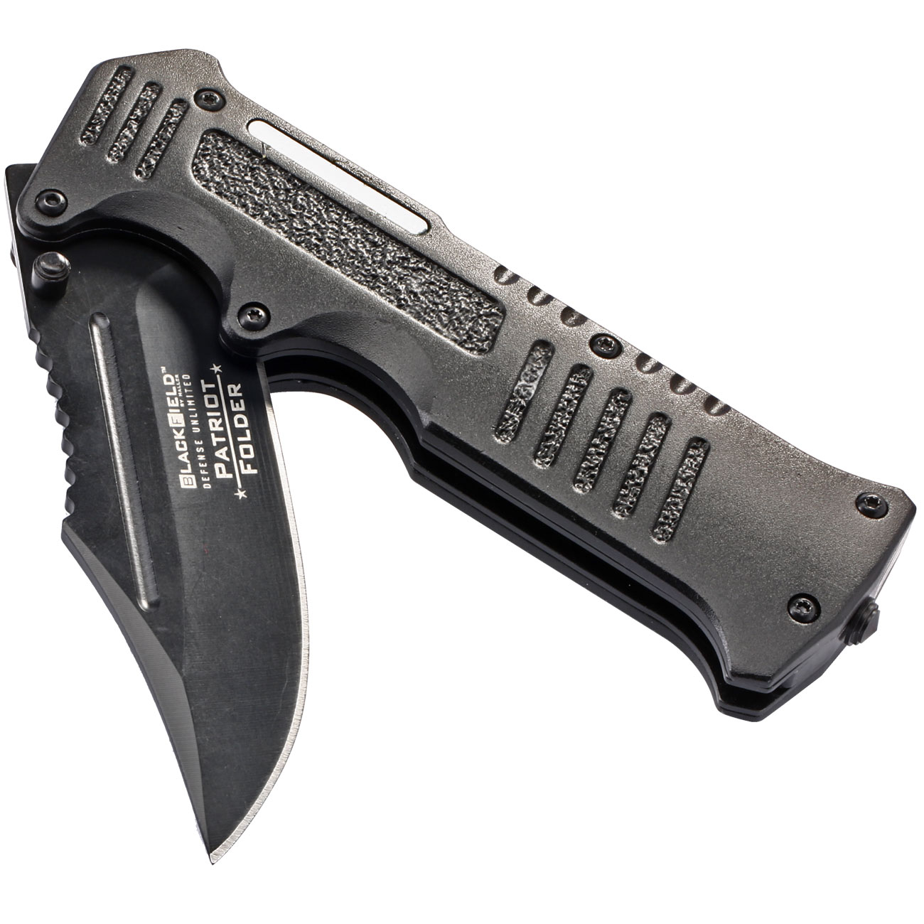 Das stabile und kräftige Einhandmesser von BlackField ist für viele Einsatzzwecke geeignet. Der Griff besteht aus Leichtmetall und ist mit einer rutschfesten Einlage ausgestattet. Durch die seitlichen fluoreszierenden Leuchtstreifen kann das Messer bei Dunkelheit leicht gefunden werden. Zudem verfügt der Griff über einen Glasbrecherdorn, einen Metall-Gürtelclip, sowie Fingermulden, welche eine optimale Handlage bieten. Die Klinge ist aus 440 rostfreiem Stahl mit Daumenauflage ist schwarz beschichtet. Verriegelt wird die Klinge mit einem Liner-Lock.
