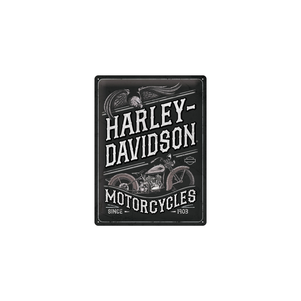 Über das gestanzte Blechschild Harley-Davidson freuen sich alle Harley-Fans. Das Schild ist ideal als Dekoration für Wohnung und Garage oder als Geschenk geeignet. Zum Befestigen befinden sich vier Montage-Löcher an den Ecken.